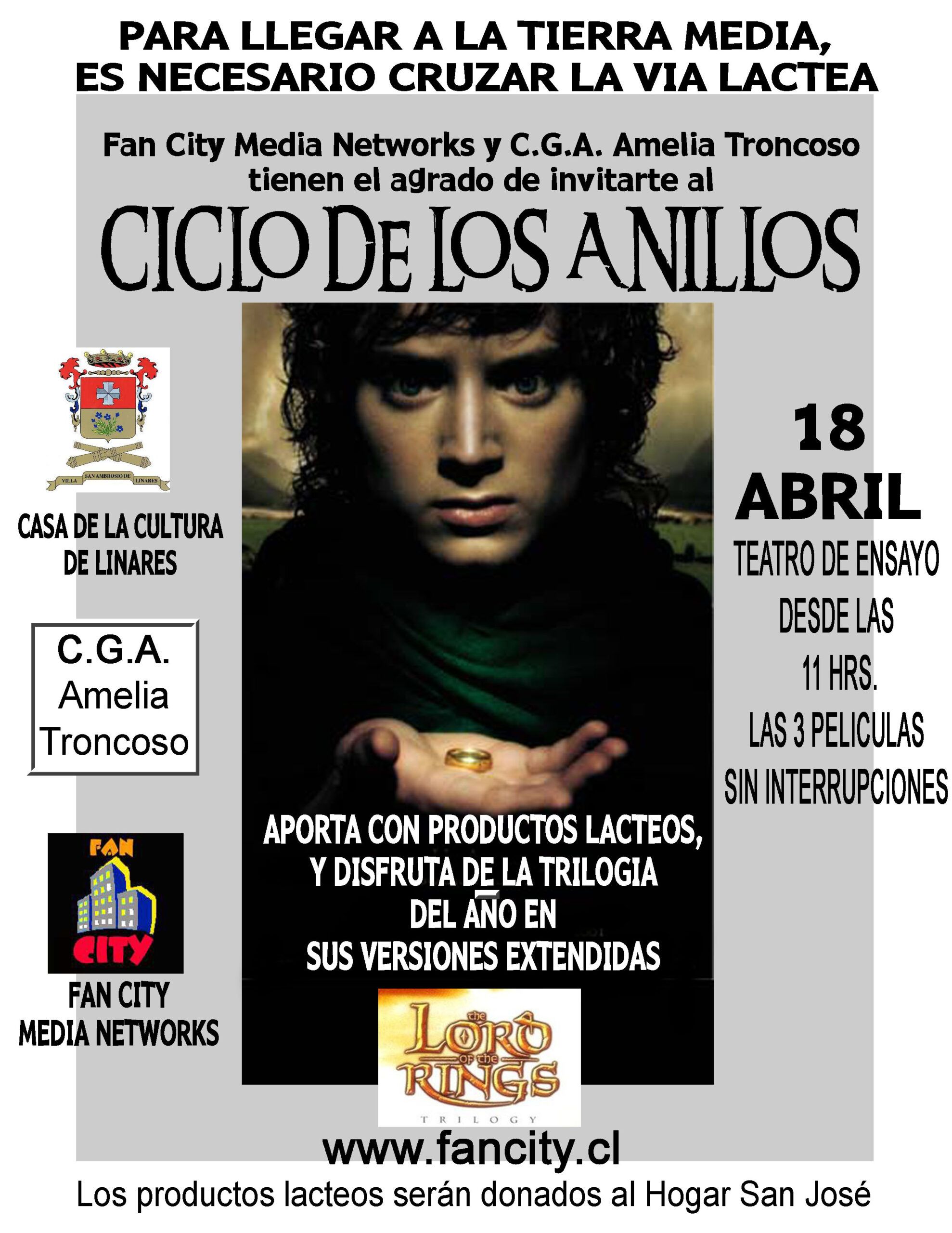 Era una oportunidad en un millón. Habíamos puesto manos en las versiones extendidas de La Comunidad del Anillo y las Dos Torres. Teníamos EL Retorno del Rey en DVD (aun no estrenaba la versión extendida), el respaldo del Centro General de Alumnos del Colegio Amelia Troncoso y su profesor tutor Abraham Sadi para apoyarnos con equipos de audio y proyección. La entonces casa de la cultura de Linares nos facilitaba el acceso a su añoso “Teatro de Ensayo” y podíamos conseguir las sillas. Armamos a pulso una idea que marcara un hito en la historia de Linares.