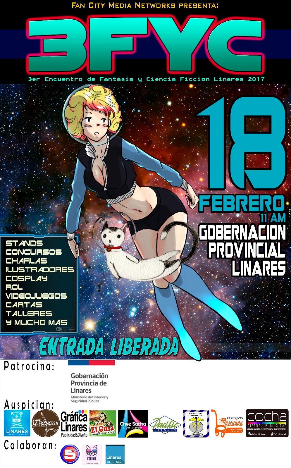 En el afiche, hace su debut Carrie, la Fan Girl (Ilustración encargada al olistrador Toly) acompañada de la gata astronauta. (ilustración de la ilustradora Javiera Araya).